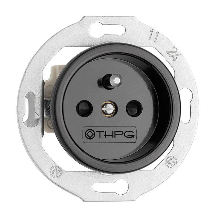 Tijdloos zwart stopcontact met penaarde en kinderbeveiliging, speciaal geschikt voor België en Frankrijk. Geïnspireerd op het originele ontwerp uit de jaren ’20. Past het moeiteloos in een standaard inbouwdoos.