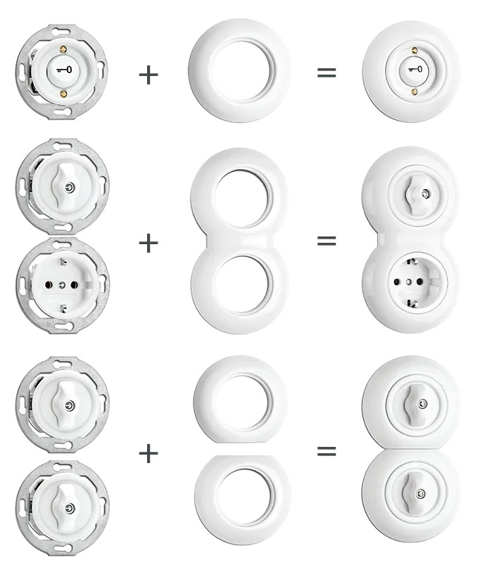 Samenstelling: basiselement van porselein, centraalplaat van porselein, wipknop van bakeliet