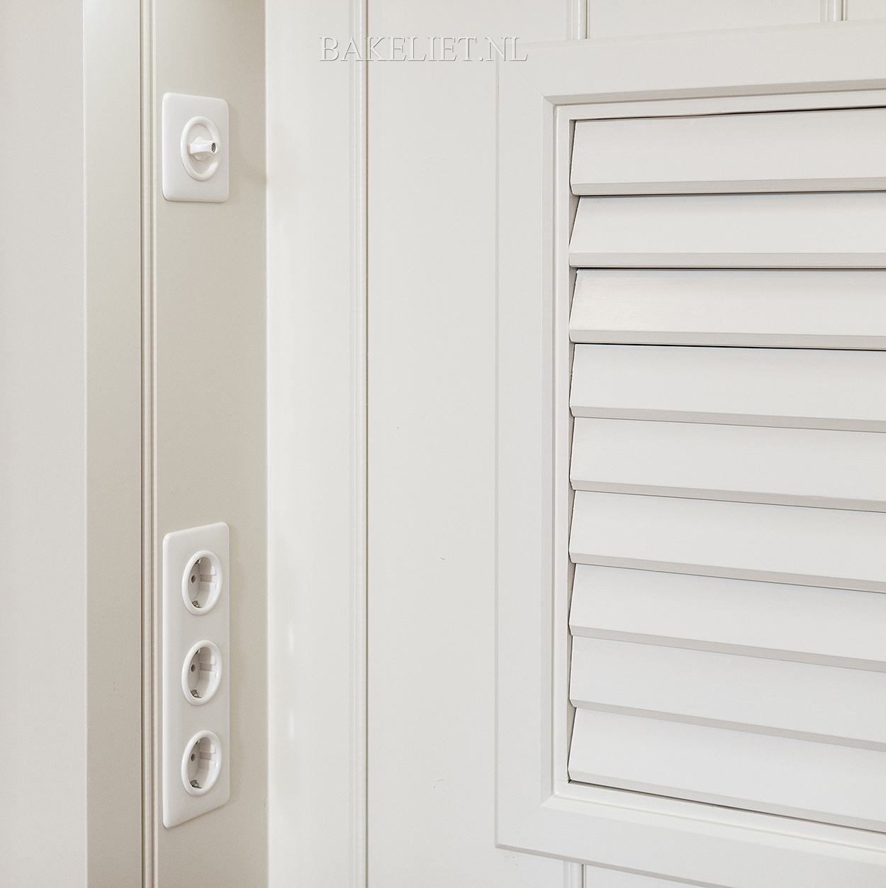 In dit sfeervolle, monumentale herenhuis is gekozen voor wit bakelieten schakelmateriaal in de kleur RAL 9010: schakelaars, stopcontacten en afdekramen in retrostijl. Deze sluiten perfect aan bij de authentieke uitstraling van de woning en versterken het karakter van het historische interieur.