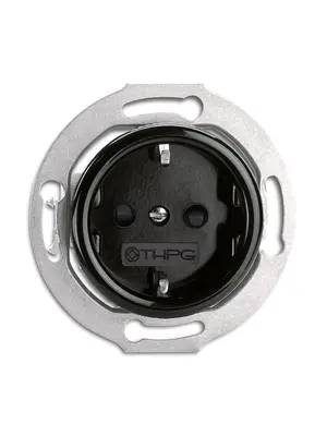 Tijdloos zwart bakelieten stopcontact met randaarde en kinderbeveiliging, geïnspireerd op het originele ontwerp uit de jaren 30. Past moeiteloos in een standaard inbouwdoos en combineert klassieke uitstraling met hedendaagse veiligheid.