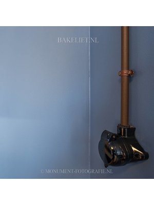 Retro zwart bakelieten opbouwstopcontact – authentieke wandcontactdoos in jaren ’40-stijl. Spatwaterdicht (IP44) en uitgevoerd met boveninvoer. Het onderblok kan worden omgedraaid, zodat je het stopcontact ook aansluit wanneer de elektra van onderen komt.